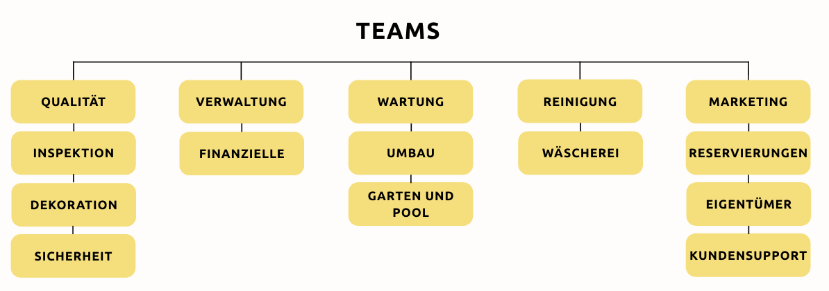 Bei der Verwaltung von Ferienwohnungen ist die Besetzung von gut aufgestellten Teams unerlässlich, um Qualität und Effizienz des Services zu gewährleisten. Jeder Schlüsselbereich wird von spezialisierten Fachkräften betreut, die einen reibungslosen Ablauf gewährleisten. Dank dieser organisierten Struktur gewährleisten wir eine schnelle und professionelle Reaktion auf alle Bedürfnisse.